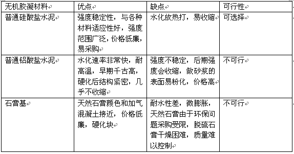 按比例準(zhǔn)確計量稱取各種原材料,在攪拌機中依 次加入填料砂、無機膠凝材料、礦物填料和外加劑充分 攪拌均勻,形成低密度蒸壓加氣混凝土專用修補劑。施 工時,按照水:修補劑為1:3的比例混合,攪拌3~5 min后使用,操作時間控制在2 h以內(nèi)。 3結(jié)果與討論 3.1無機膠凝材料的選擇 對各種無機膠凝材料優(yōu)缺點進(jìn)行了分析,見表1。