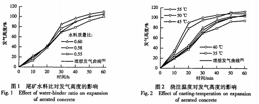 由圖2可知,隨著溫度的升高,發(fā)氣高度也隨之增加,發(fā)氣速度和稠化速度均增加.相比之下,稠化速度受溫度的影響程度比發(fā)氣速度大.當料漿溫度為35℃時,不能達到100%發(fā)氣.當料漿低于35cc時,發(fā)氣速度與稠化速度慢.當40—55℃時,稠化速度逐步增加,但料漿塑粘性阻力較小,發(fā)氣反應加速,發(fā)氣劑利用充分,膨脹性能穩(wěn)定.當高于55℃時,料漿塑粘阻力增大,流動性喪失,發(fā)氣困難.當澆注溫度40~45℃時,發(fā)氣速度較均勻,發(fā)氣鹽線比較接近加氣混凝土Al粉理想發(fā)氣曲線。因此,發(fā)氣膨脹較優(yōu)溫度范圍為40-45oC.料漿初始溫度由澆注用水溫度所決定,本試驗中主要是通過溫度為60℃的熱水來滿足此要求