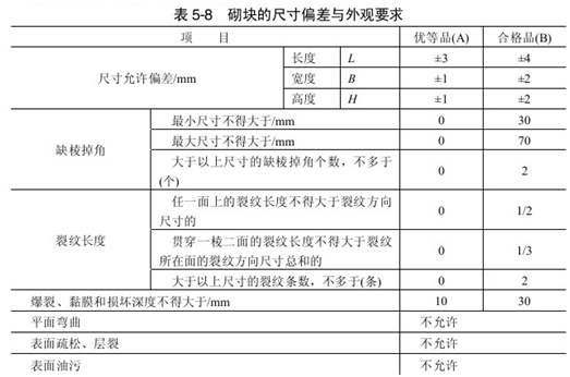 3.砌塊等級 砌塊按抗壓強度來分的強度級別有 A1.0、A2.0、A2.5、A3.5、A5.0、A7.5 和 A10 七個。 砌塊按干密度來分,有B03、B04、B05、B06、B07 和B08六個級別。 砌塊按尺寸偏差與外觀質(zhì)量、干密度、抗壓強度和抗凍性分為優(yōu)等品(A)、合格品(B) 兩個等級。 砌塊標記順序是名稱(代號 ACB)、強度級別、干密度、規(guī)格尺寸、產(chǎn)品等級。例如:強度級別為A3.5、干密度級別為B05、規(guī)格尺寸為 600 mm × 200 mm × 250 mm 優(yōu)等品的蒸壓加氣磚設備砌塊,其標記為 ACB A3.5 B05 600 × 200 × 250A GB 11968